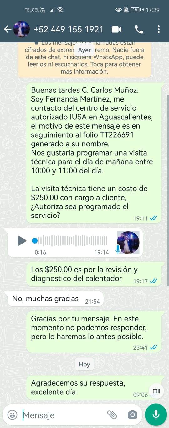 Tengo un boiler que no mantiene el piloto encendido y no lo puedo prender. Quería revisar si le pueden dar servicio y los costos, tiene el calentador 4 años supongo que ya no entra en garantía. |