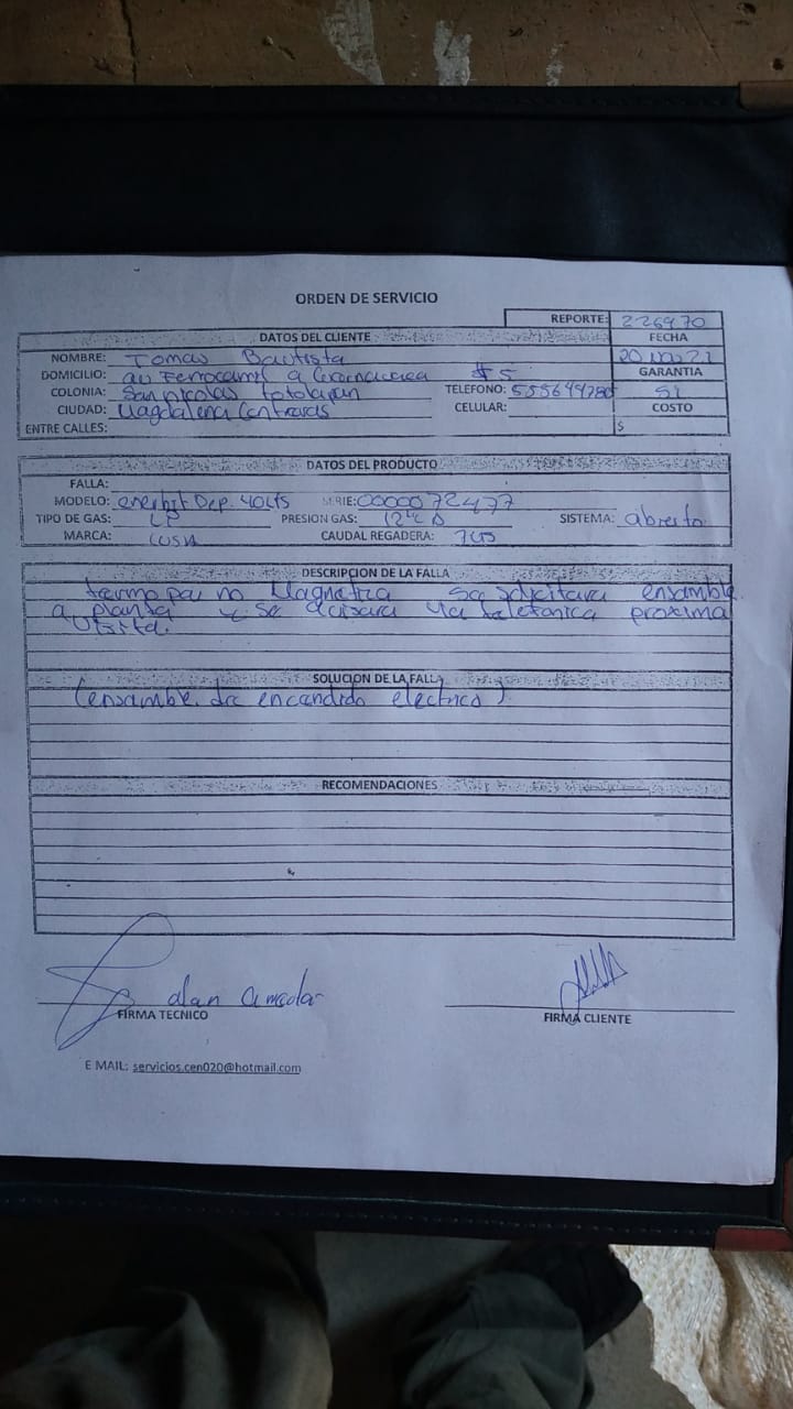 | Orden Interna | 58012570 | Falla Real | Termostato dañado | ||||||||||||||||