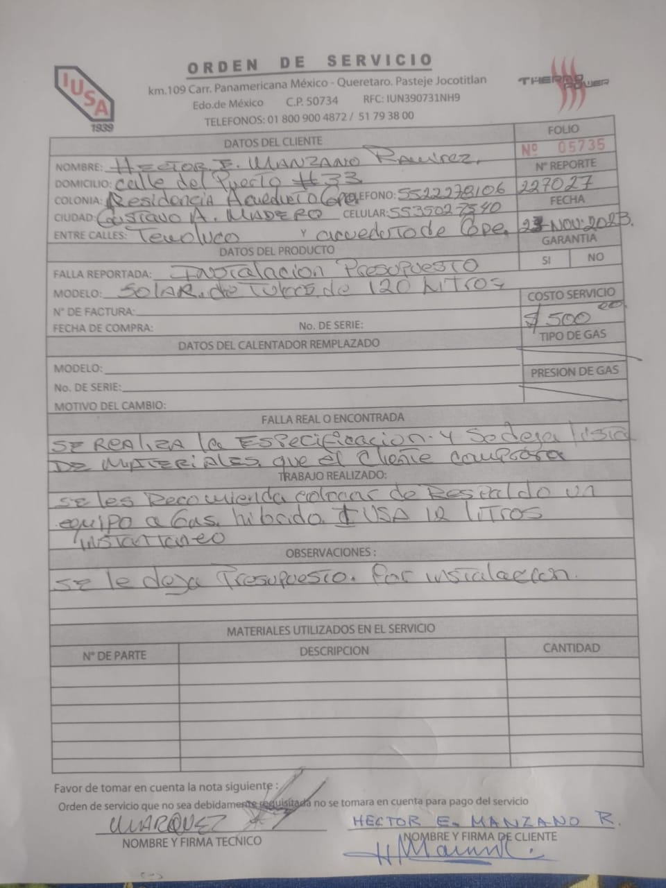 | Refacciones Utilizadas | NO | Tipo de Refacción | N/A | ||||||||||||||||
