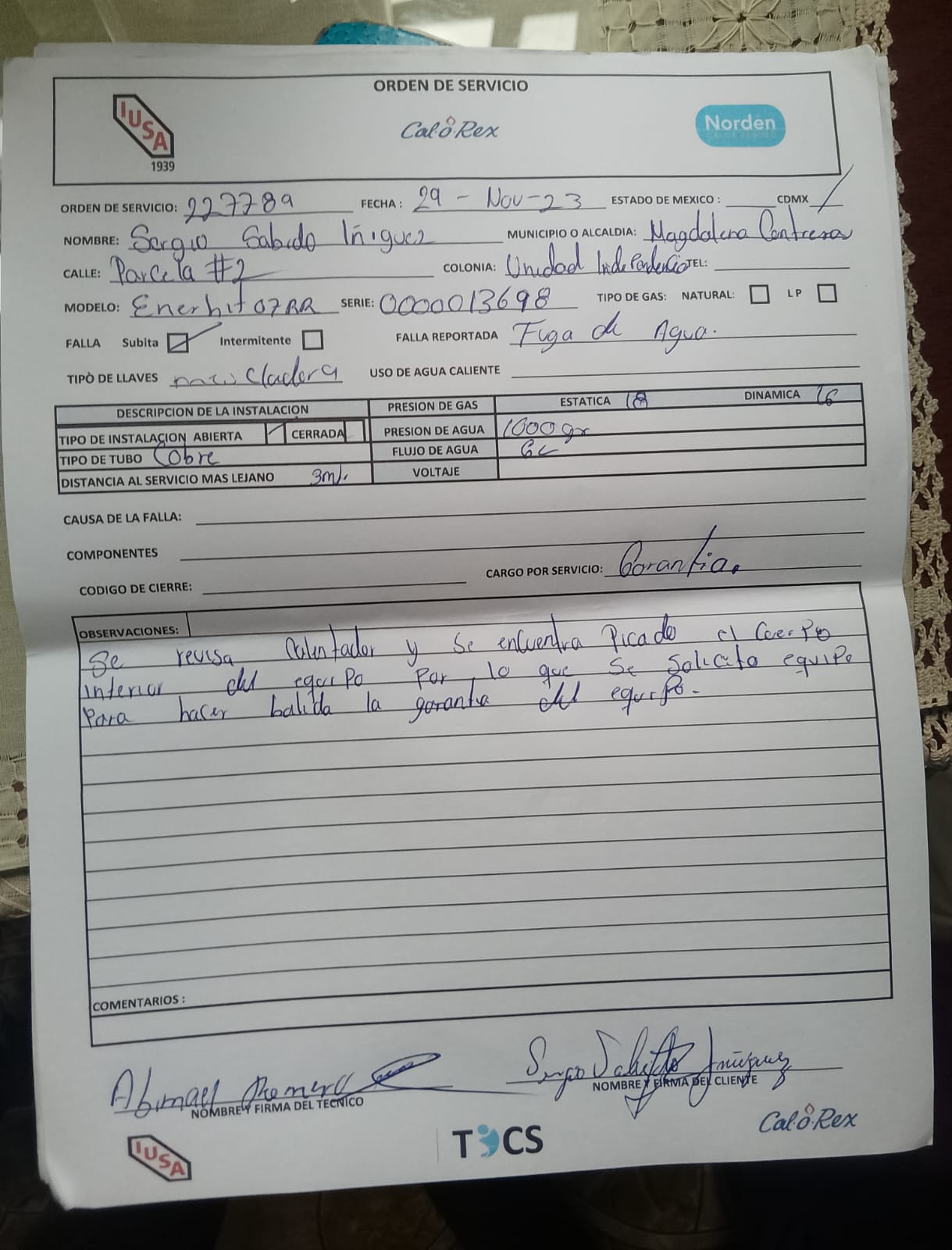 | Se comunica usuario indicando que su calentador esta tirando agua, la fuga se presento hace como 1 mes esta suministrado a traves de un tinaco, cuenta con regulador de baja presion.