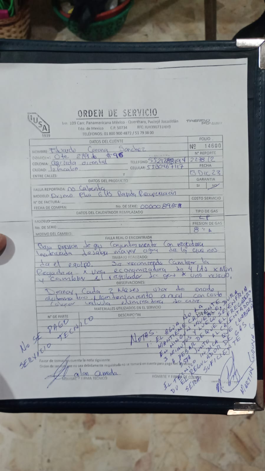 | Se comunica usuario reportando CALENTADOR PASO PRIMO PLUS 06L LP me comenta que la falla es No calienta , utiliza gas lp , suministro de agua de tinaco |