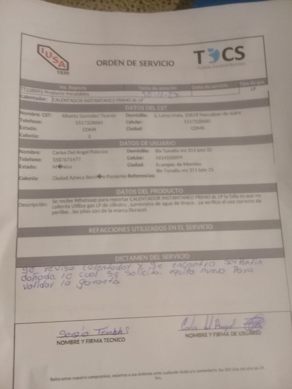 | Refacciones Utilizadas | NO | Tipo de Refacción | N/A | ||||||||||||||||