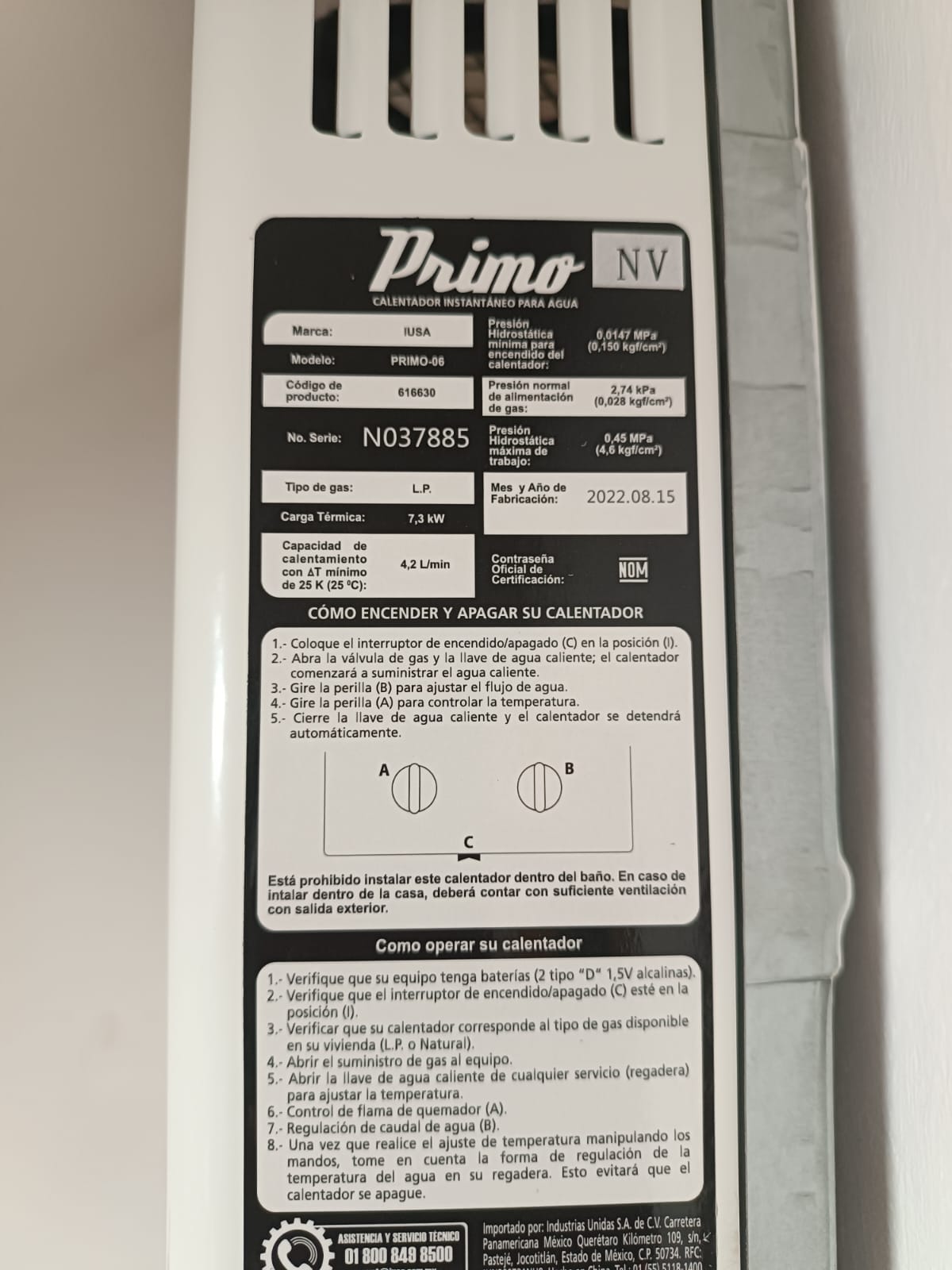 | Material | CALENTADOR INSTANTANEO PRIMO 6L LP | Tipo Producto | |