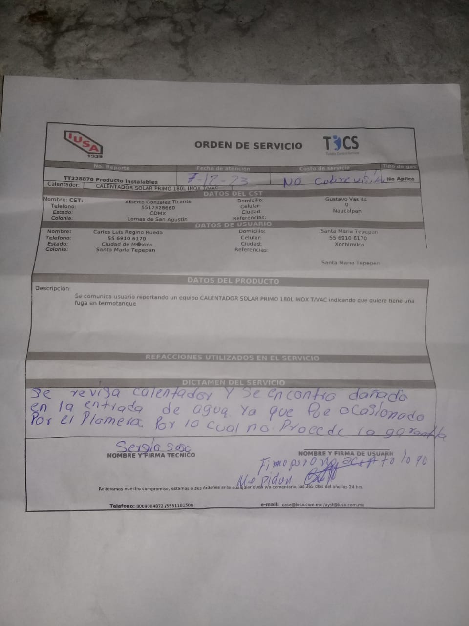 | Se comunica usuario reportando un equipo CALENTADOR SOLAR PRIMO 180L INOX T/VAC indicando que quiere tiene una fuga en termotanque |