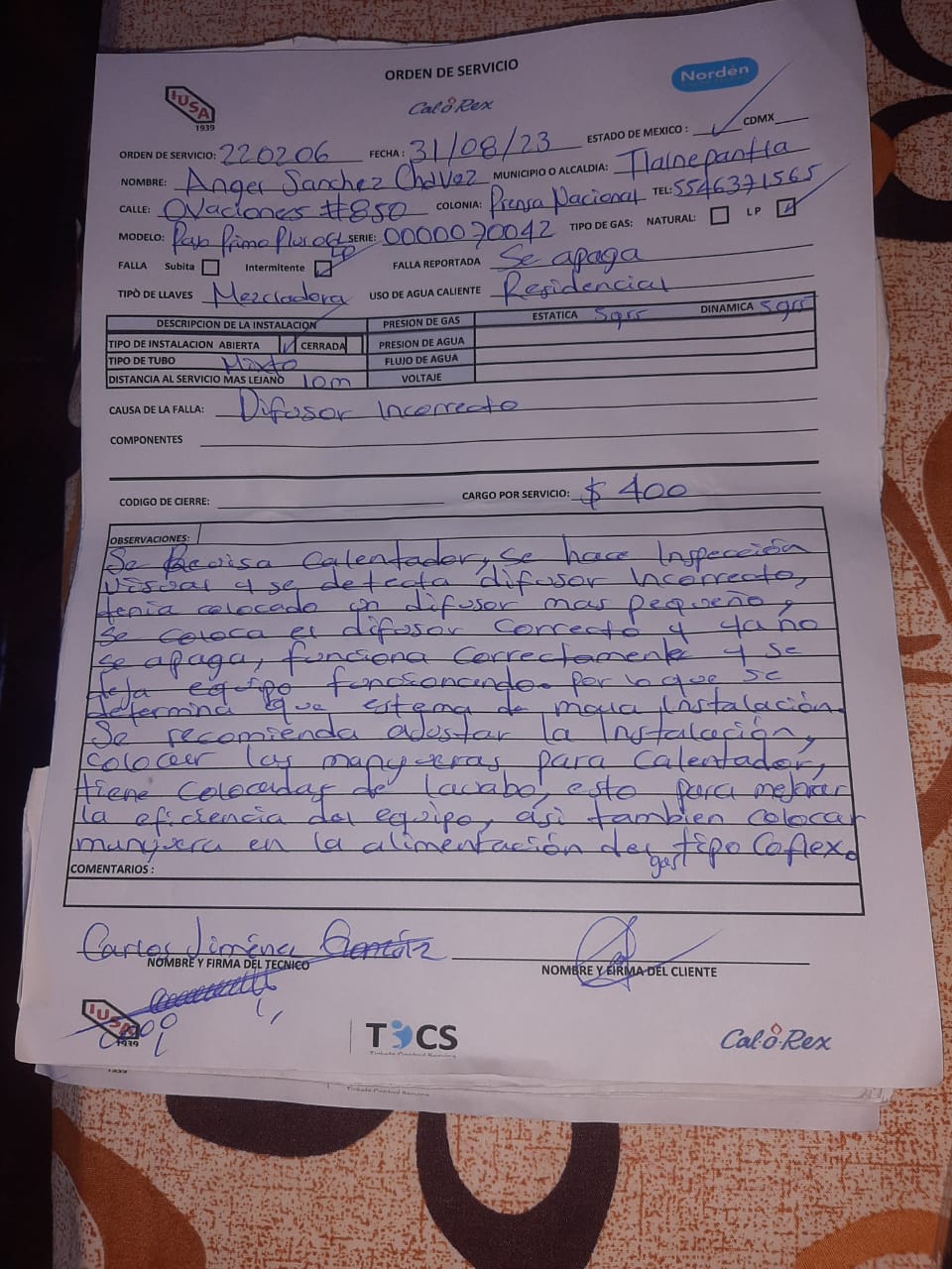 | Refacciones Utilizadas | NO | Tipo de Refacción | N/A | ||||||||||||||||