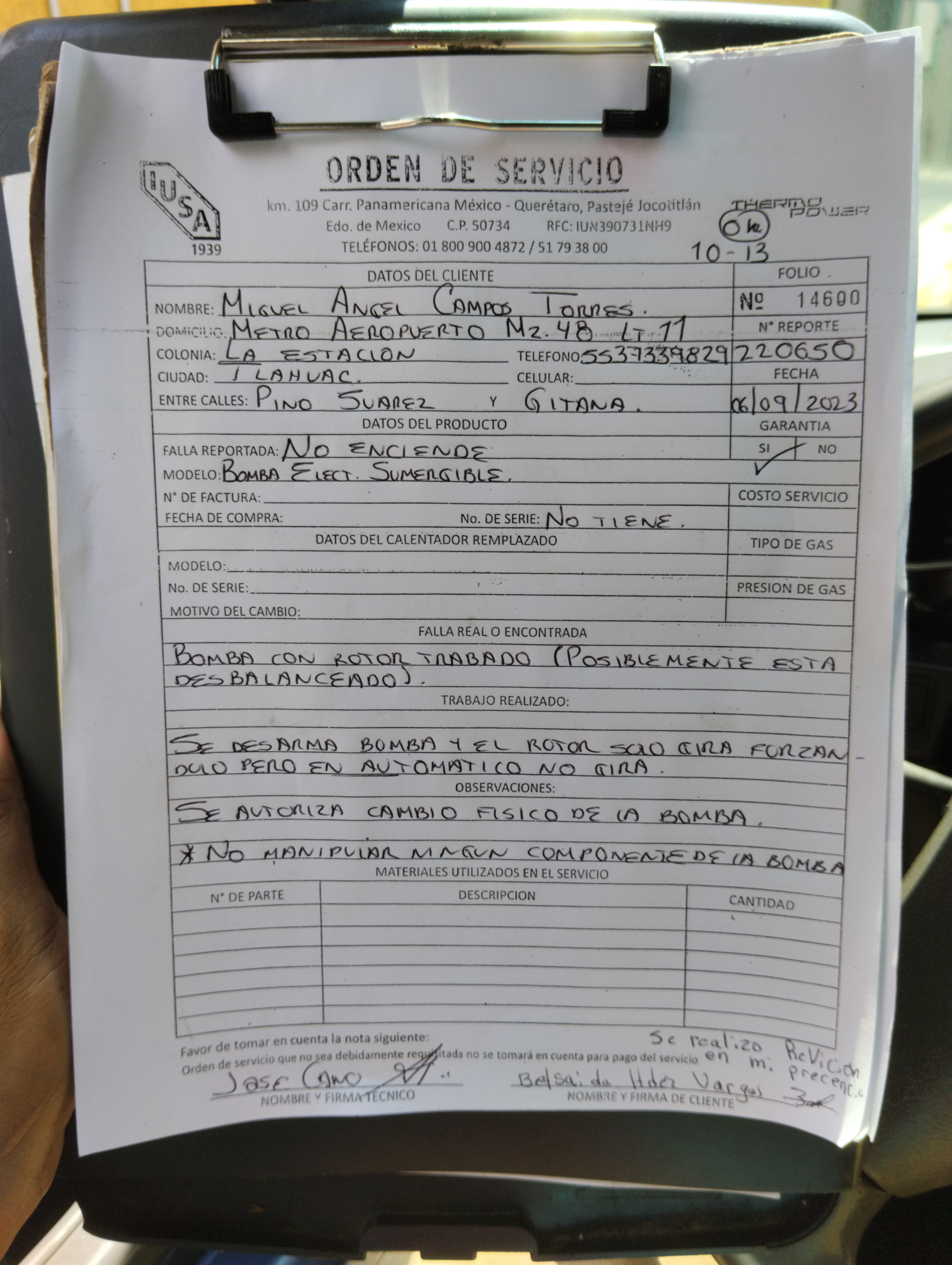 | Se comunica usuario reportando una BOMBA ELEC SUMERGIBLE MULTIETAPAS 1.2 HP menciona que no enciende y bota la pastilla el problema se presento desde el 1 de agosto |