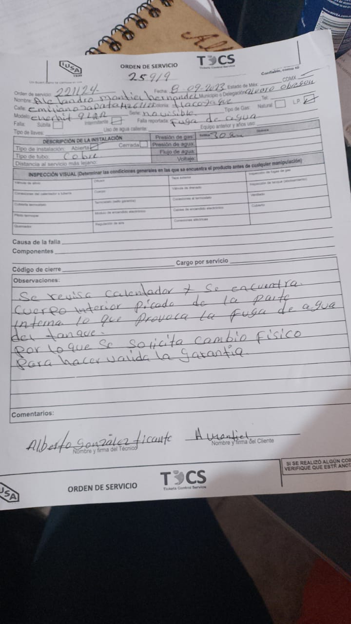 | Usuario se comunica por medio de llamada telefonica ya que reporta que su calentador gotea de adentro del deposito del calentador