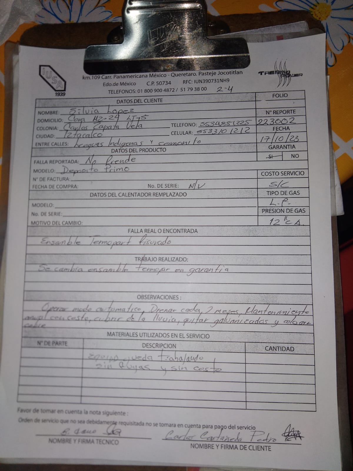 | Técnico | Jose Cano Sanchez | Fecha Asistencia | 2023-10-17 07:55:00 | ||||||||||||||||