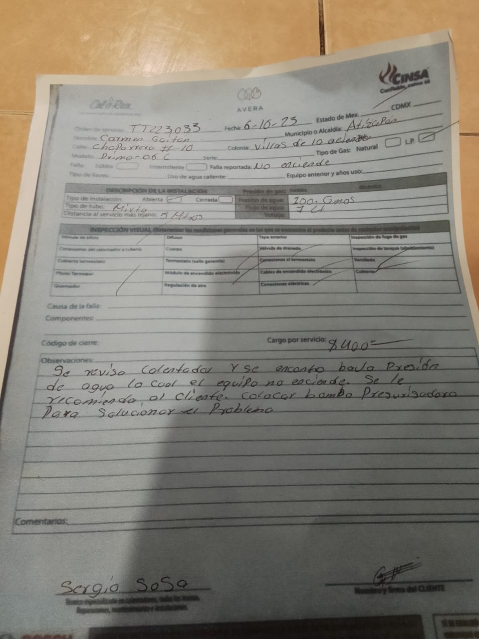 | Técnico | Alberto Gonzalez | Fecha Asistencia | 2023-10-06 15:00:00 | ||||||||||||||||