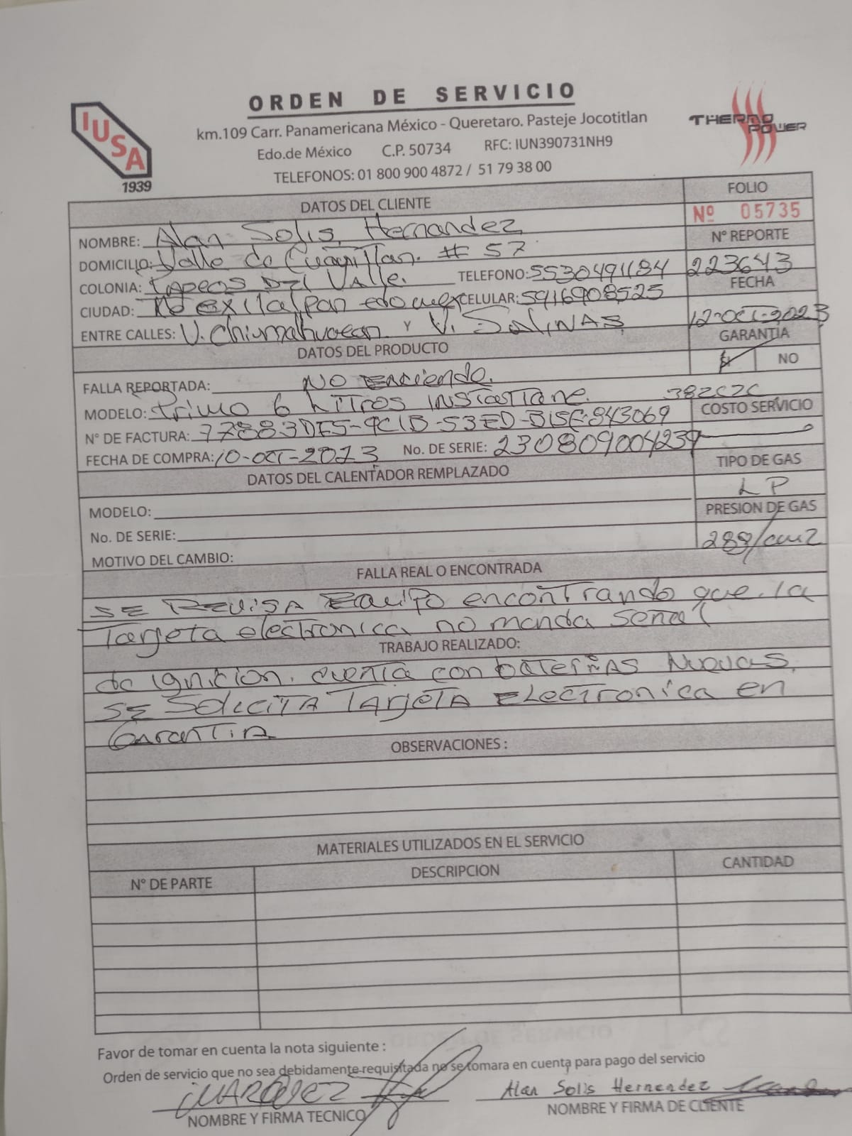 | Refacciones Utilizadas | SI | Tipo de Refacción | ENCENDIDO ELECTRONICO P/CALENTADOR | ||||||||||||||||
