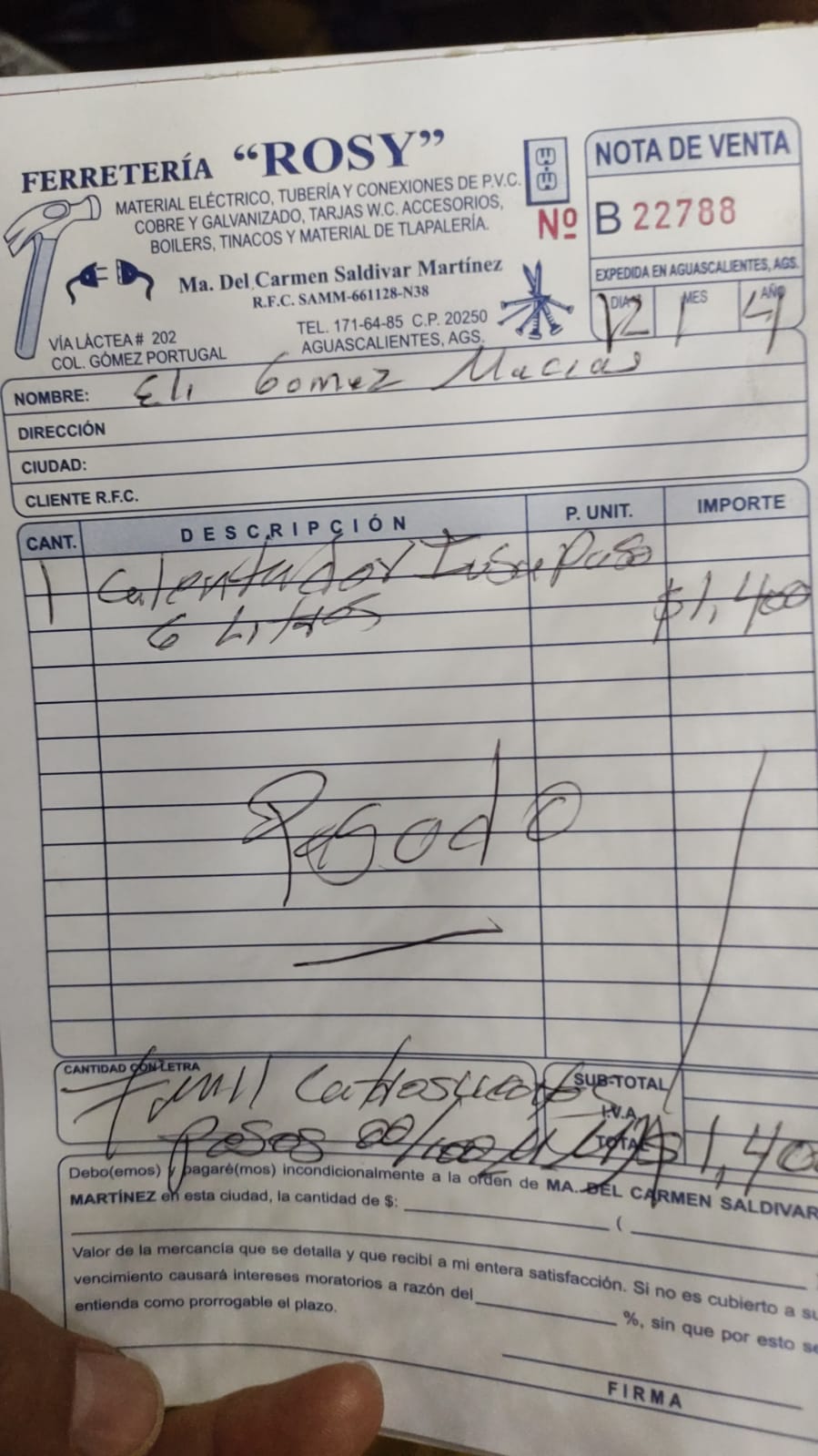 | Fecha de Compra | 2024-01-12 | Lugar de Compra | Ferreteria |