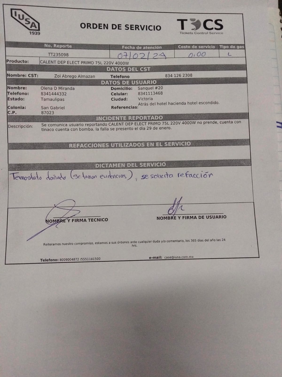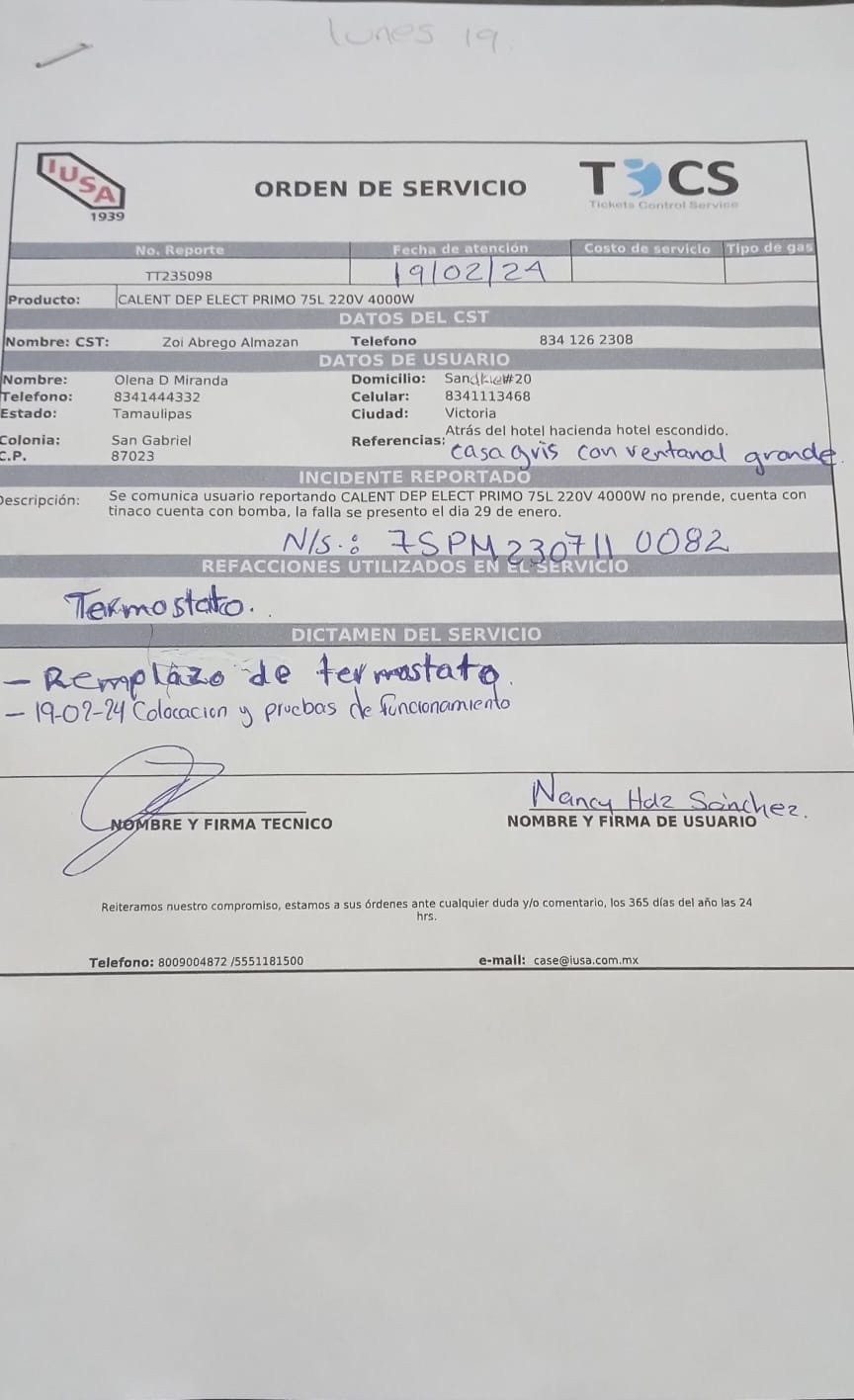 | Refacciones Utilizadas | SI | Tipo de Refacción | TERMOSTATO IUSATROL QyP 7/16 | ||||||||||||||||
