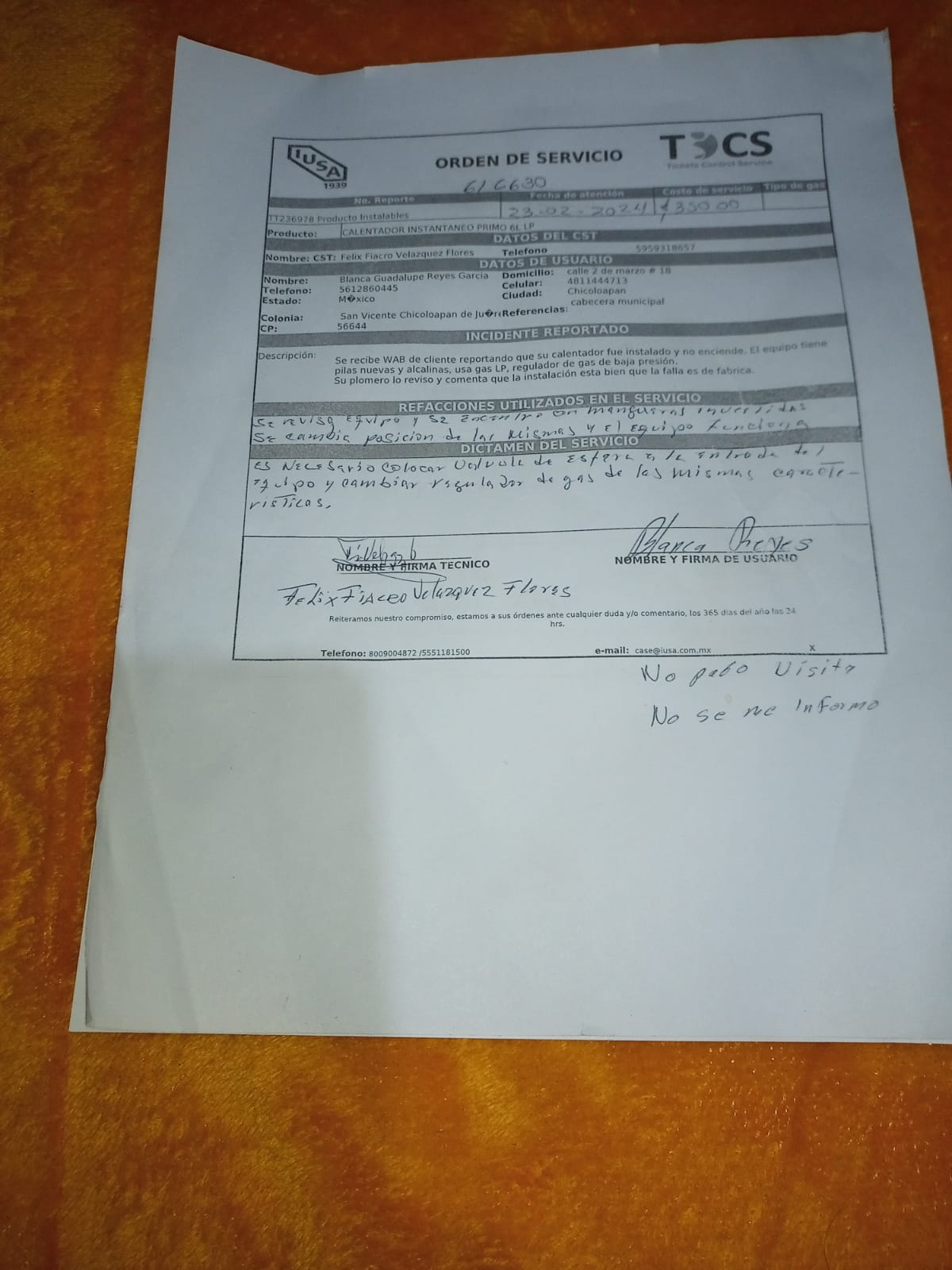 | Técnico | Felix Fiacro Velazquez Flores | Fecha Asistencia | 2024-02-24 08:58:00 | ||||||||||||||||