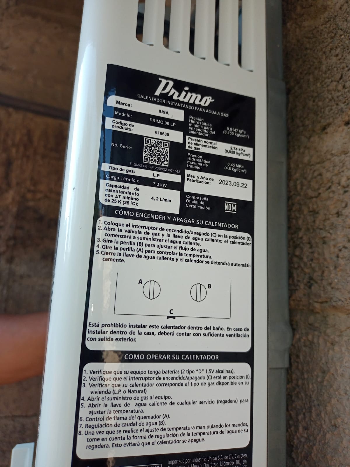 | Material | CALENTADOR INSTANTANEO PRIMO 6L LP | Tipo Producto | |