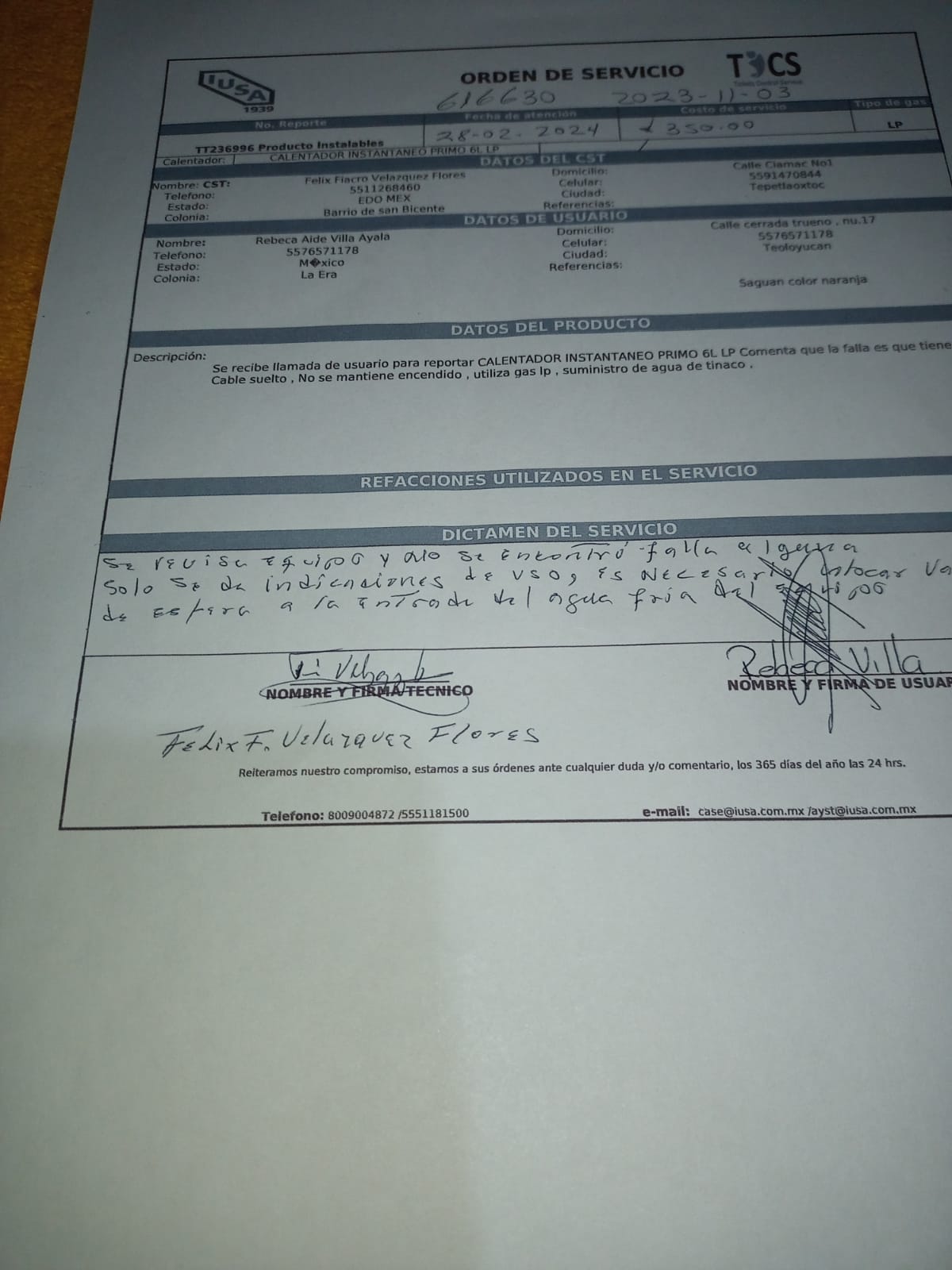 | Técnico | Felix Fiacro Velazquez Flores | Fecha Asistencia | 2024-02-28 13:00:00 | ||||||||||||||||