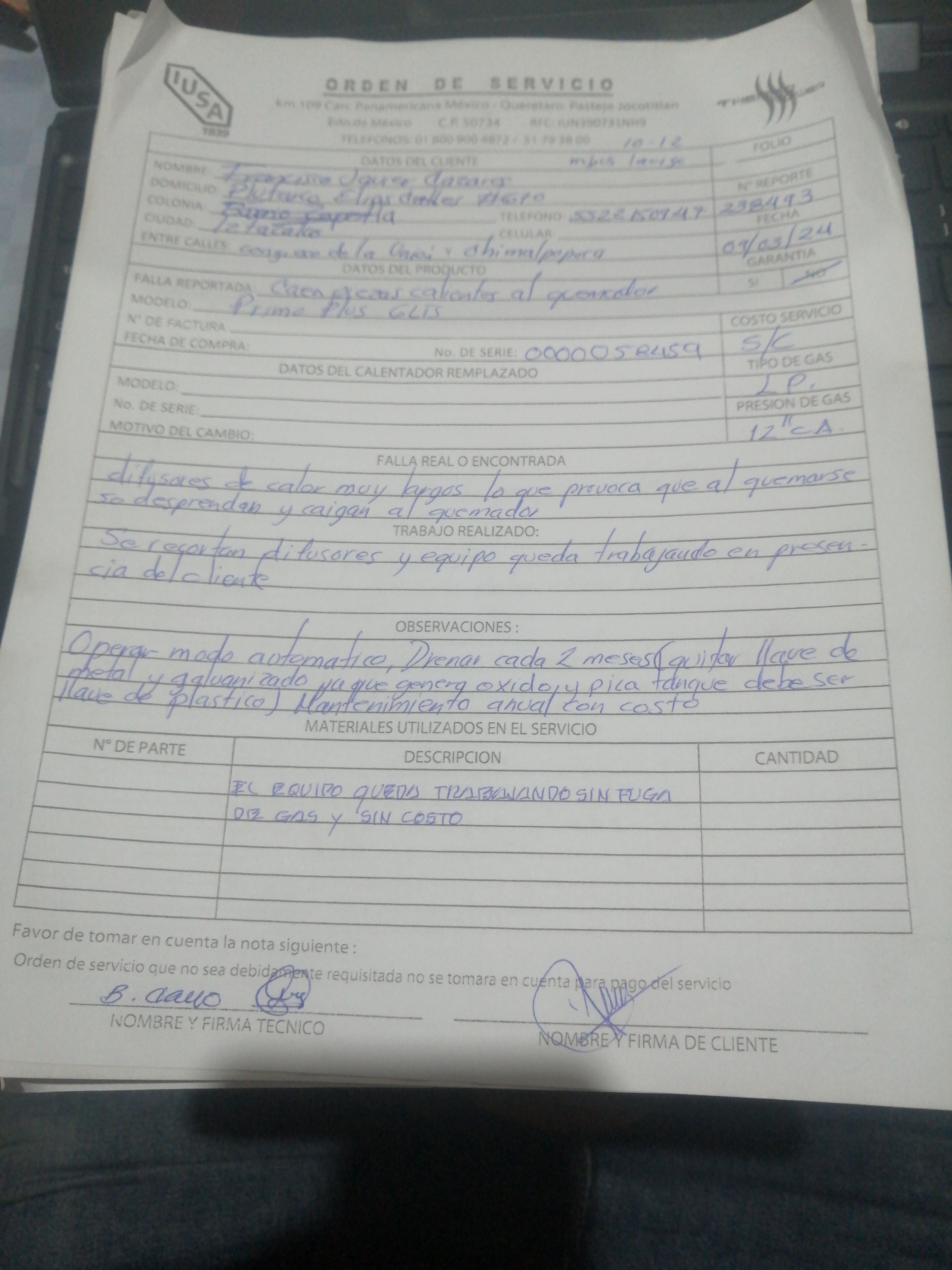 | Se comunica usuario reportando un calentador tiro piezas calientes por la parte de abajo, indica que enciende, da chispa, marca primo plus, utiliza gas LP, se encuentra instalado a un tanque estacionario, cuenta con regulador de gas de baja presión, se suministra a través de la red publica, la falla se presento el dia de ayer 03 marzo de 2024.