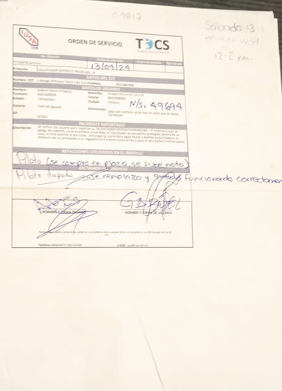 | Refacciones Utilizadas | SI | Tipo de Refacción | CONJ.TERMOPAR-PILOTO PARA ENC.-ELEC. NT | ||||||||||||||||