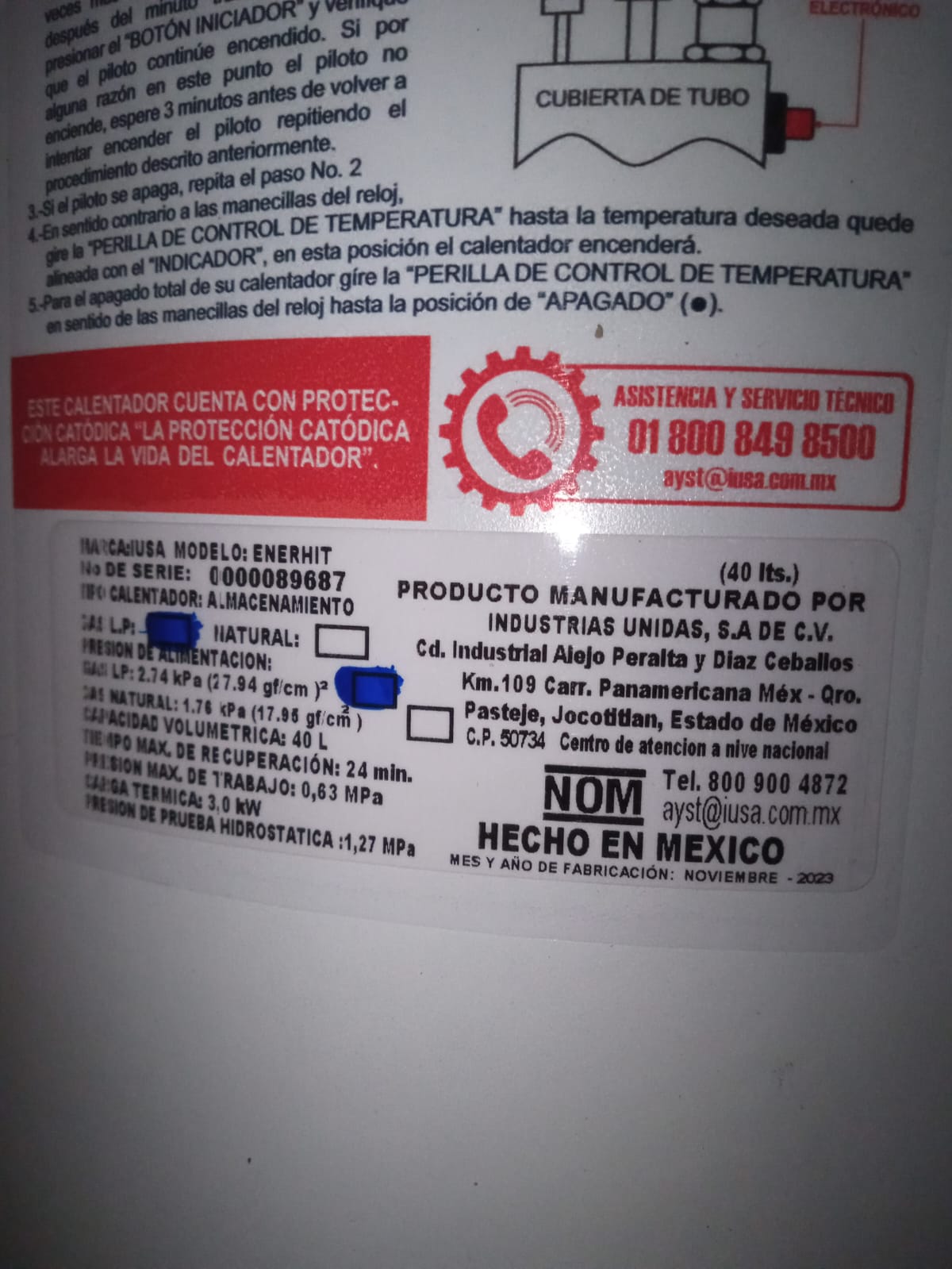 | Material | CALENTADOR DEPOSITO ENERHIT 40L. LP | Tipo Producto | |