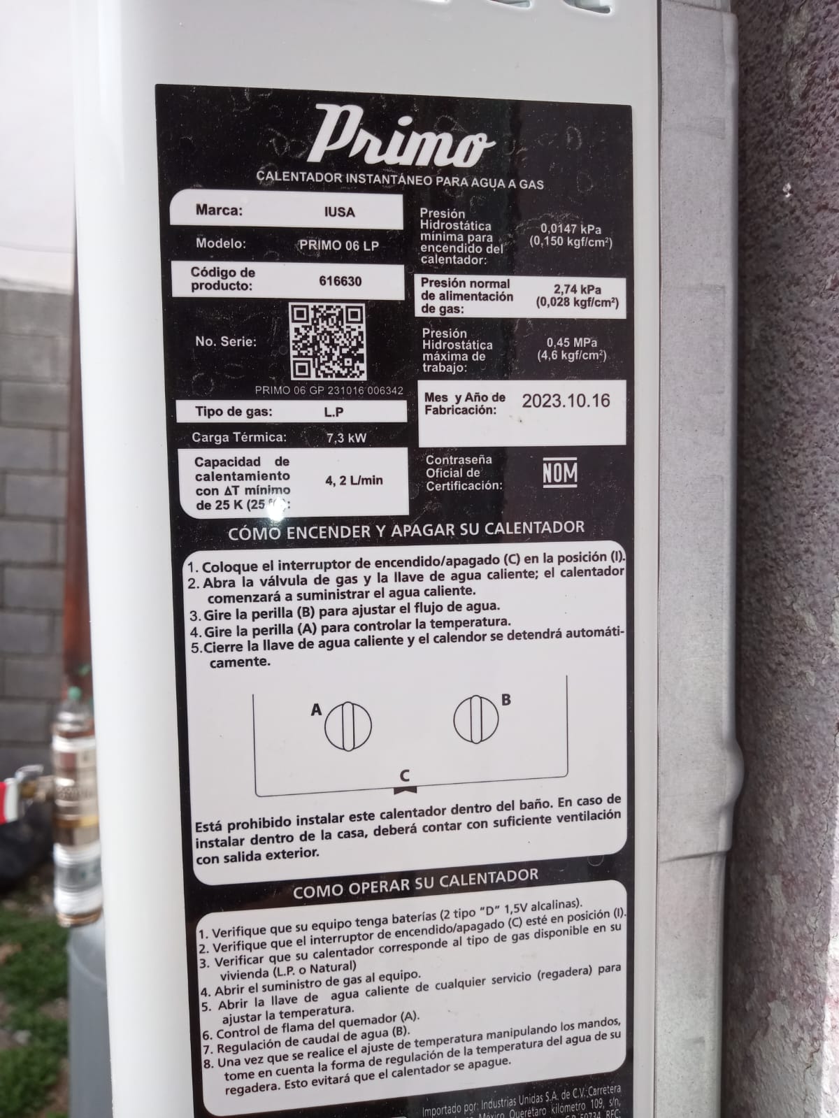 | Material | CALENTADOR INSTANTANEO PRIMO 6L LP | Tipo Producto | |
