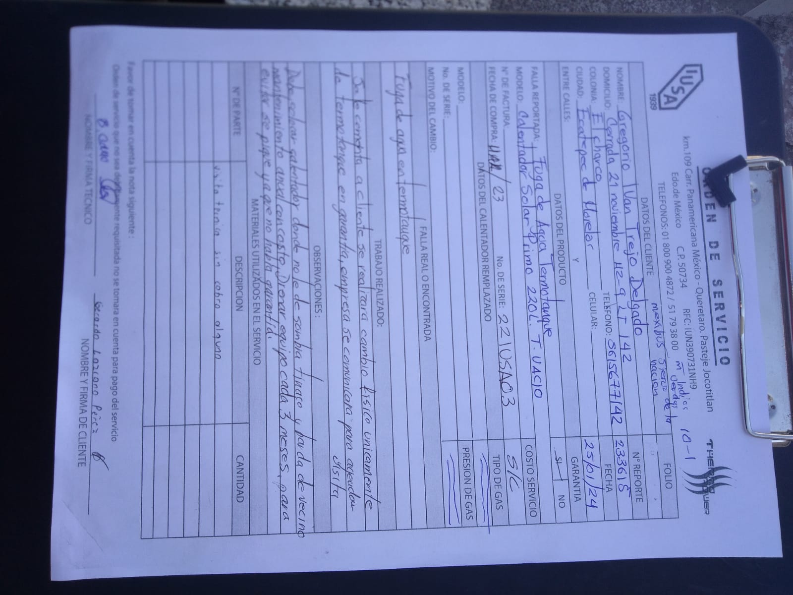 | Orden Interna | 56017051 , 56017072 JC | Falla Real | Fuga de agua en el termotanque | ||||||||||||||||