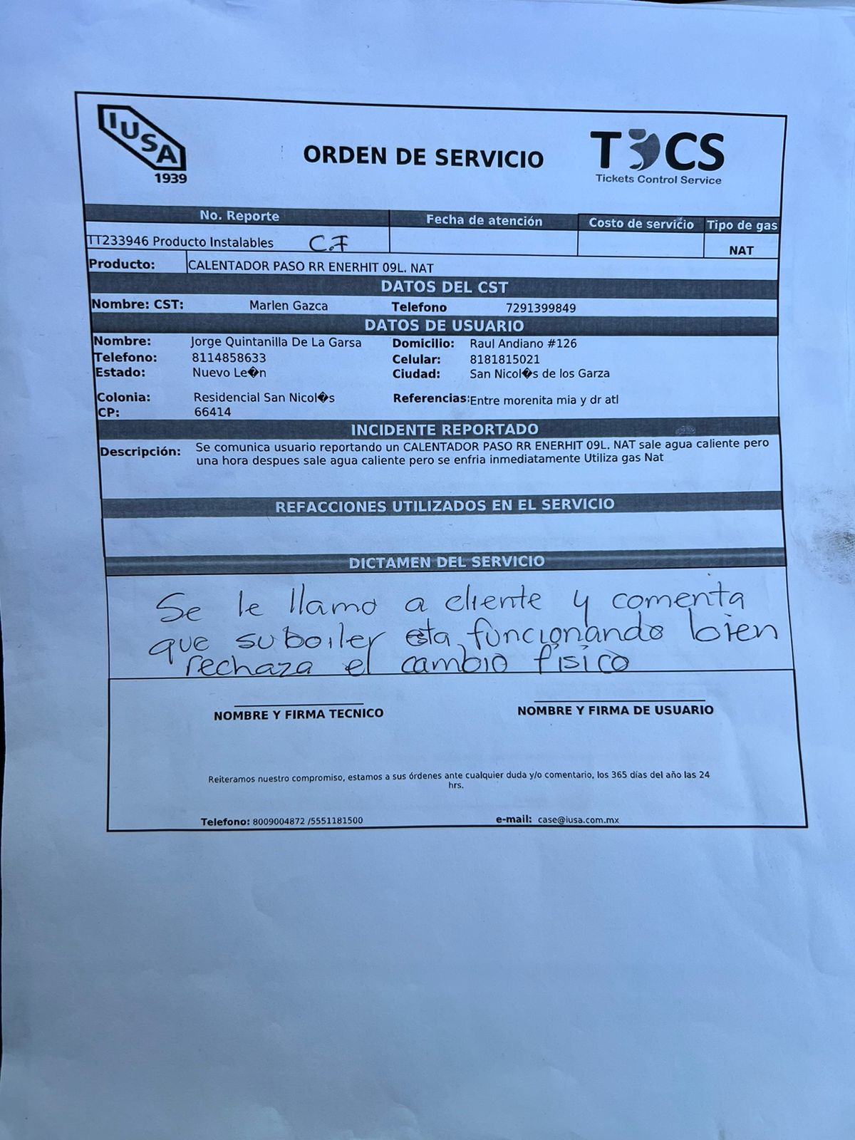 | Orden Interna | 58013241 | Falla Real | Calentador enciende pero se apaga | ||||||||||||||||