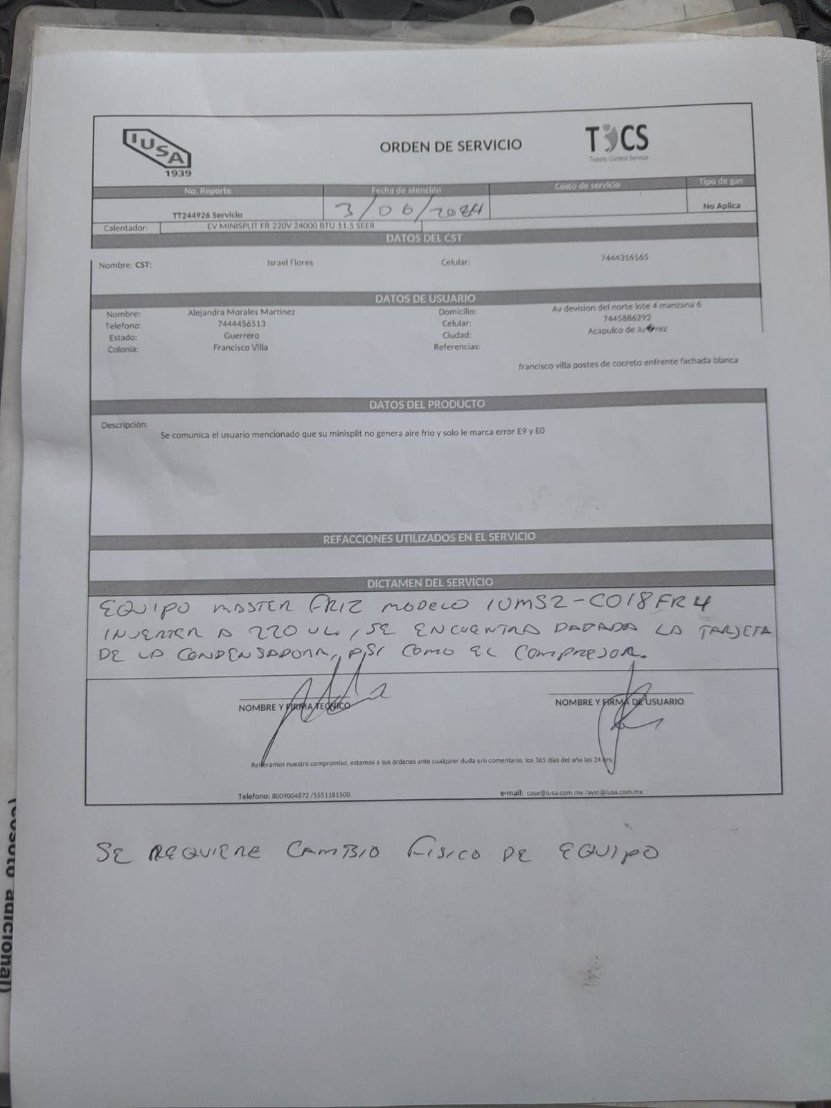 | Se comunica el usuario mencionado que su minisplit no genera aire frio y solo le marca error E9 y E0