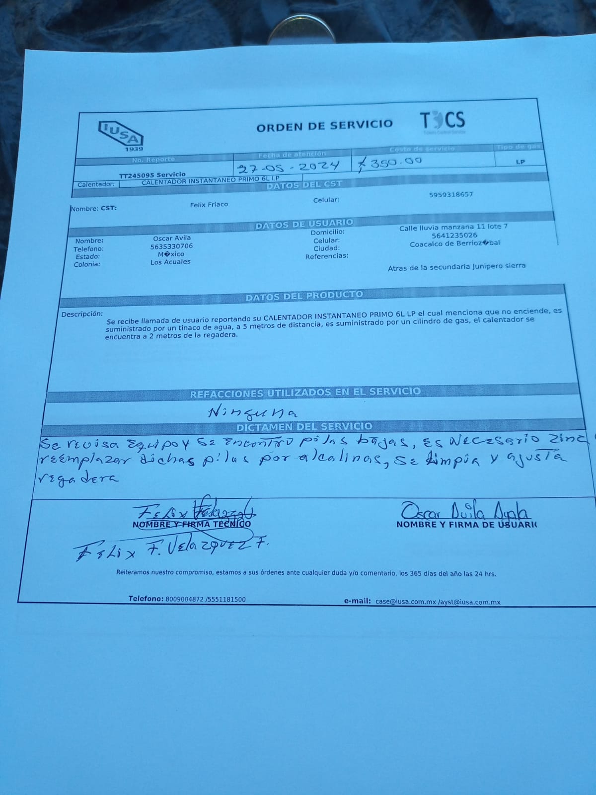 | Se recibe llamada de usuario reportando su CALENTADOR INSTANTANEO PRIMO 6L LP el cual menciona que no enciende, es suministrado por un tinaco de agua, a 5 metros de distancia, es suministrado por un cilindro de gas, el calentador se encuentra a 2 metros de la regadera. |