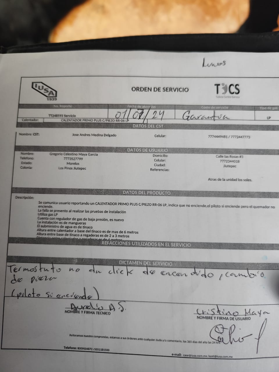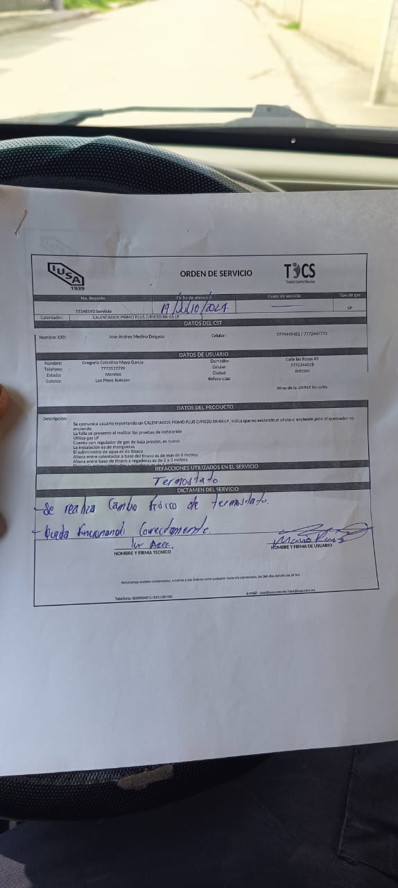 La falla se presento al realizar las pruebas de instalación Utiliza gas LP Cuenta con regulador de gas de baja presión, es nuevo La instalación es de mangueras El subministro de agua es de tinaco Altura entre calentador a base del tinaco es de mas de 6 metros Altura entre base de tinaco a regaderas es de 2 a 3 metros Distancia entre calentador a regaderas es de 4 metros |