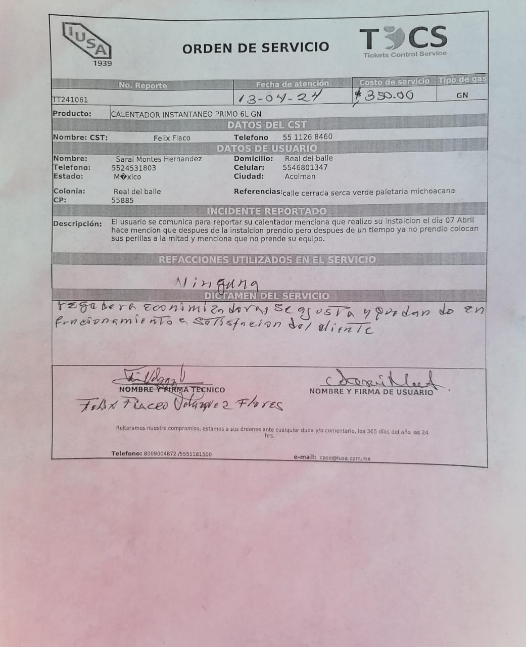 | El usuario se comunica para reportar su calentador menciona que realizo su instalcion el dia 07 Abril hace mencion que despues de la instalcion prendio pero despues de un tiempo ya no prendio colocan sus perillas a la mitad y menciona que no prende su equipo. |