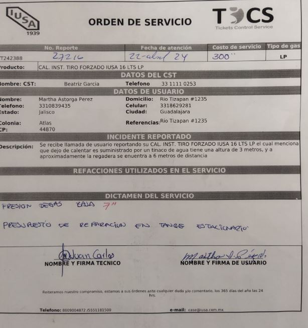 | Se recibe llamada de usuario reportando su CAL. INST. TIRO FORZADO IUSA 16 LTS LP el cual menciona que dejo de calentar es suministrado por un tinaco de agua tiene una altura de 3 metros, y a aproximadamente la regadera se enuentra a 6 metros de distancia |