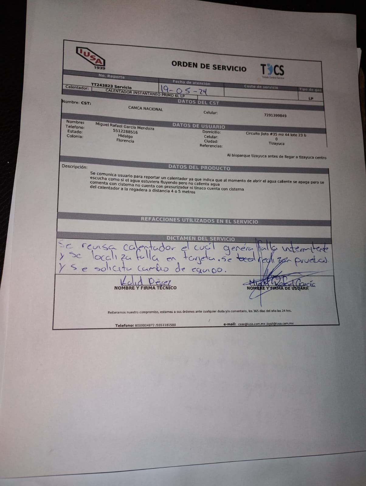 | Orden Interna | 56017965 | Falla Real | Calentador enciende pero no calienta agua | ||||||||||||||||