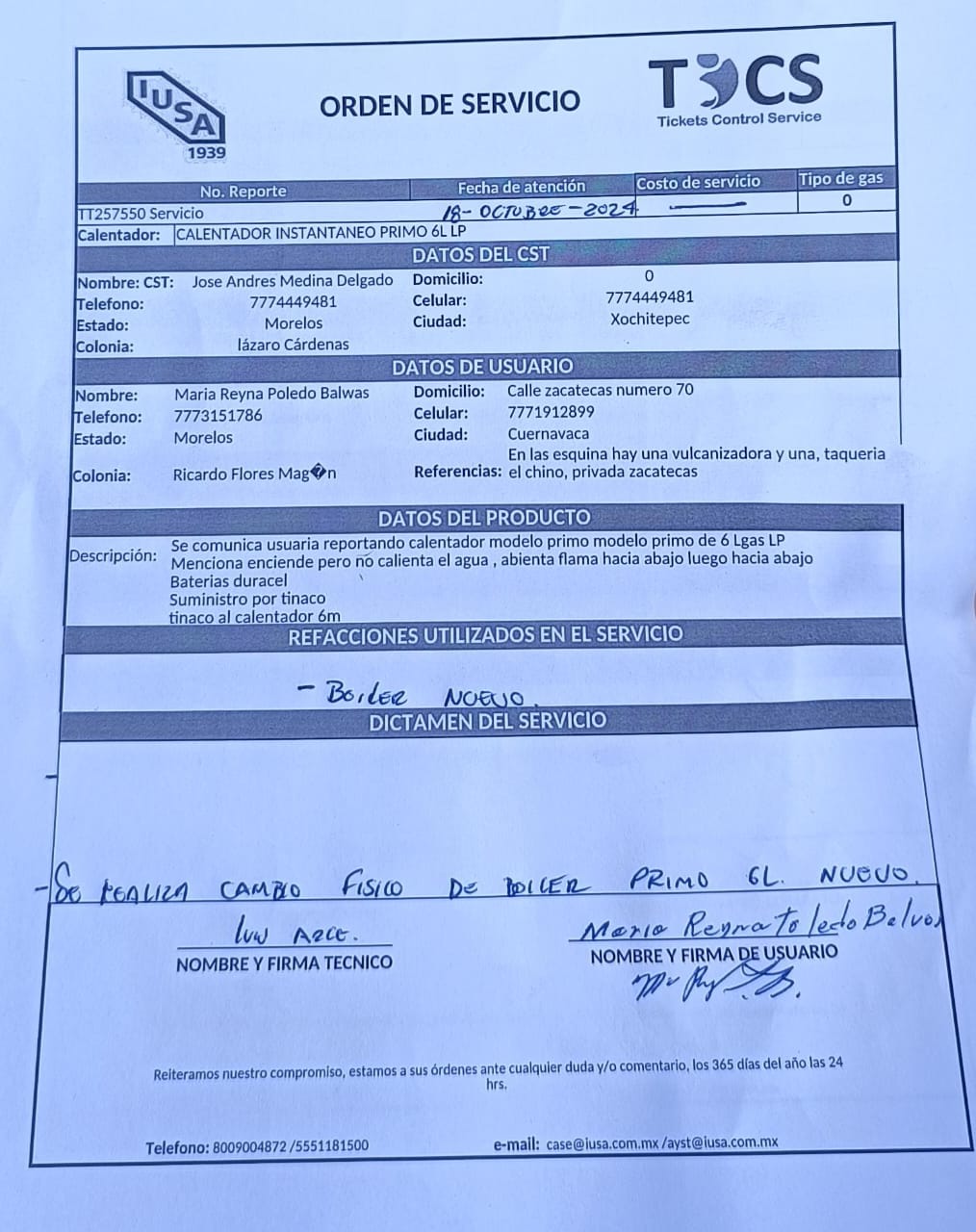 | Se comunica usuaria reportando calentador modelo primo modelo primo de 6 Lgas LP