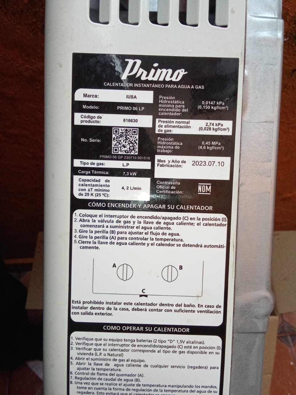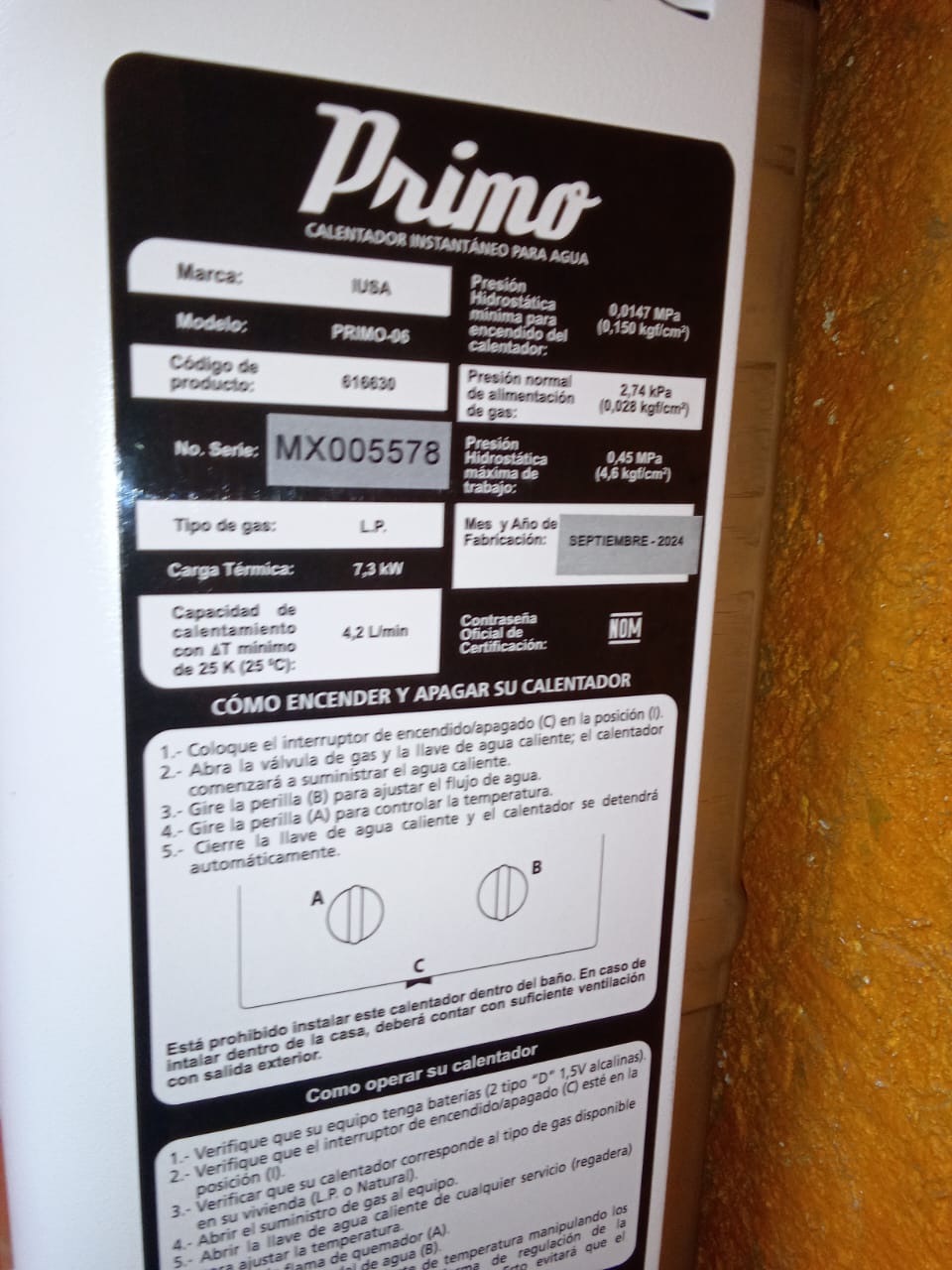 | Material | CALENTADOR INSTANTANEO PRIMO 6L LP | Tipo Producto | |
