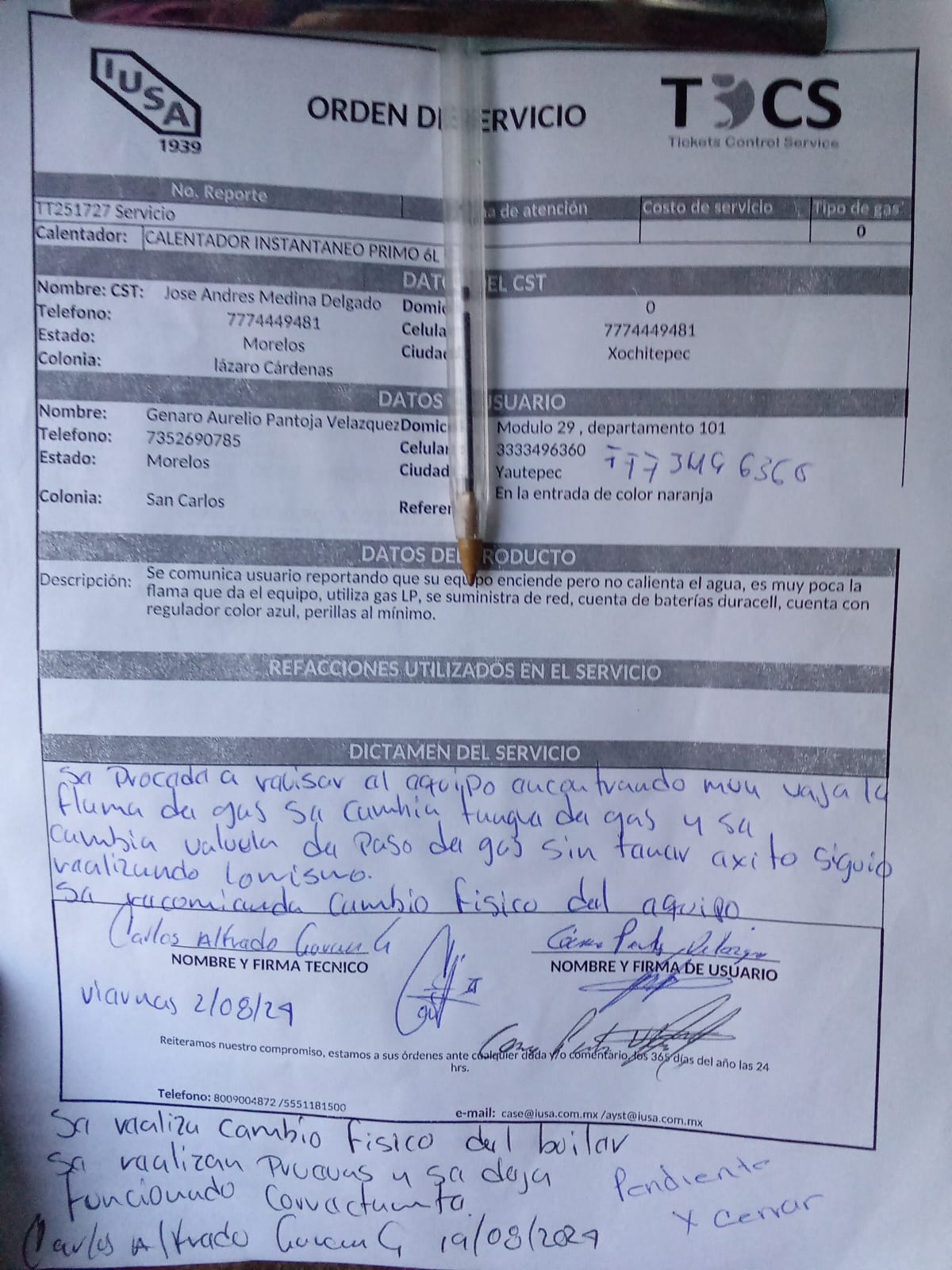 | Orden Interna | 56018598 | Falla Real | Calentador enciende pero no calienta agua | ||||||||||||||||