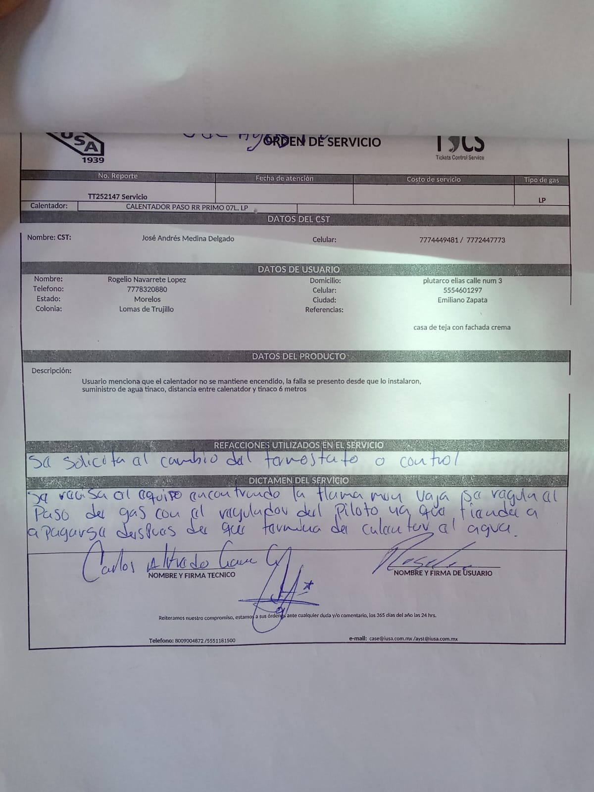 | Orden Interna | 58014460 | Falla Real | Fuga de agua interna del calentador | ||||||||||||||||