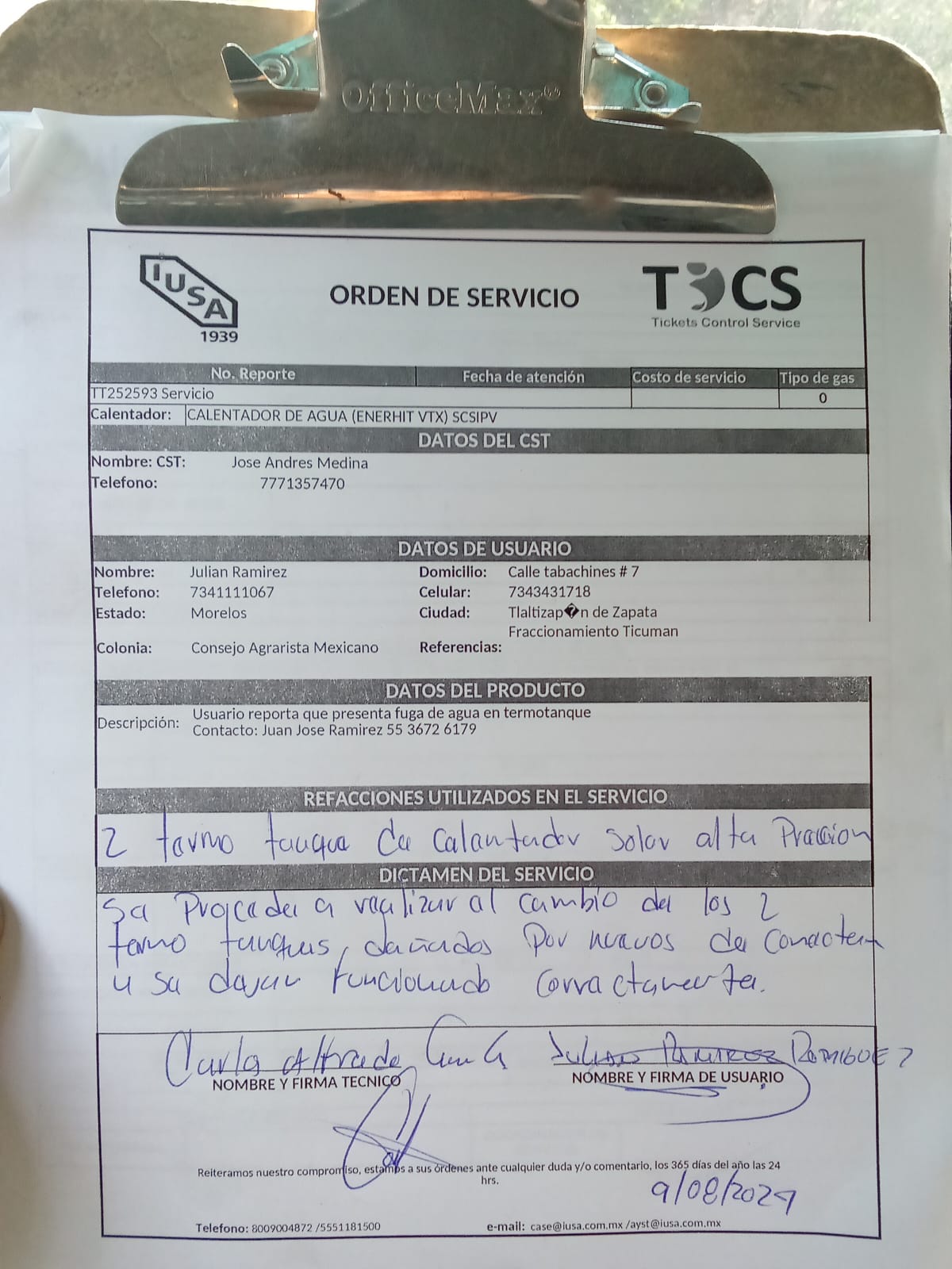 | Refacciones Utilizadas | SI | Tipo de Refacción | TERMOTANQUE CON BASE METALICA 23" | ||||||||||||||||